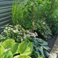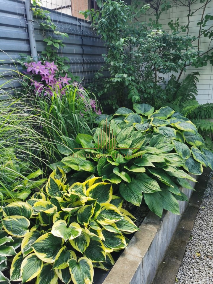 Ziemia najwyższej jakości, została zakupiona i przywieziona w 20 kilogramowych workach 2 kontenery - oddzielny rodzaj do nasadzeń i do trawnika. Podwyższone rabaty w murkach z wykorzystaniem kamienia dekoracyjnego. Trawa przygotowana przez Instytut Nasiennictwa, specjalnie pod rodzaj ziemi w ogrodzie).