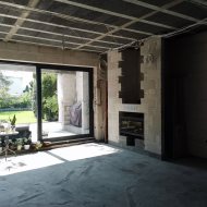 - salon z otwarta kuchnią pow. 55,3m2 z piwniczką na wina, barem kawowym (duży świetlik dachowy przechodzący przez górną łazienkę do salonu na dole), duży kominek hiszpański PANADERO, z wymaganym systemem eco design, w salonie znajduje się okno aluminiowe przesuwne HST o wymiarach 4,0 x 2,80 m w kolorze antracyt z potrójną szyba antywłamaniowa, prowadzące do ogrodu