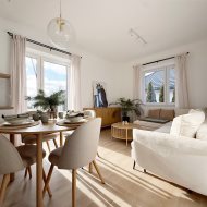 Dom stanowi alternatywę dla mieszkania w bloku – brak wspólnych ścian z sąsiadami, własna działka oraz niskie koszty utrzymania.