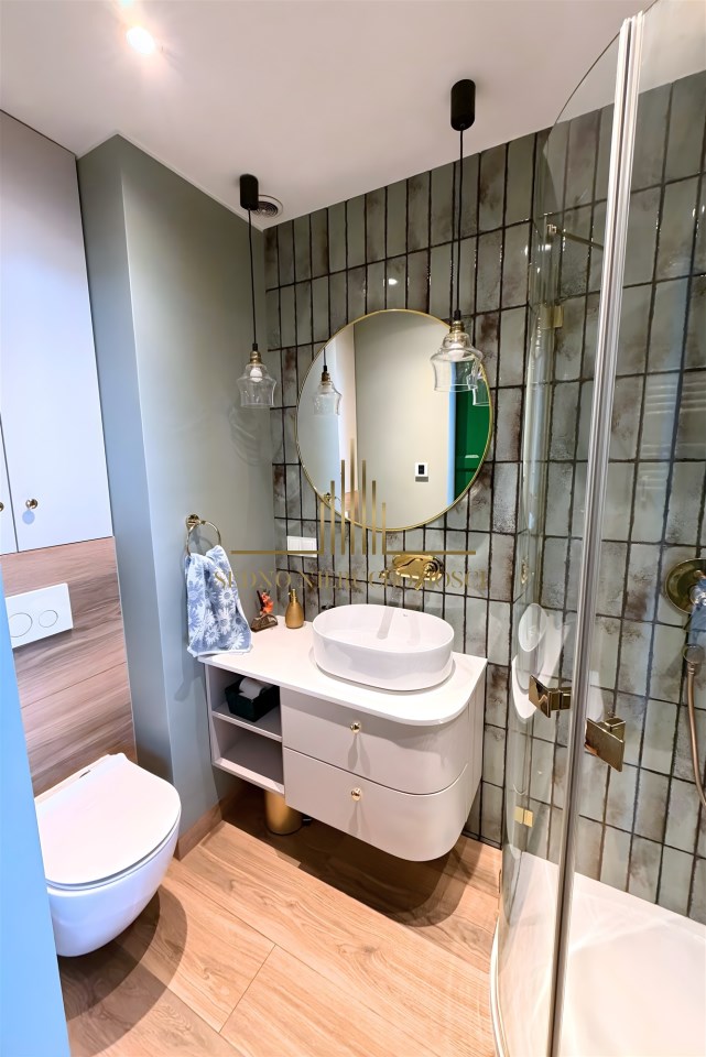 W całym mieszkaniu ogrzewanie podłogowe, możliwość regulowania temperatury indywidualnie dla każdego pomieszczenia.