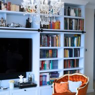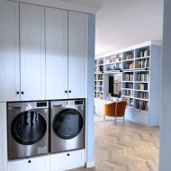 Stolarka meblowa, spersonizowana, wykonana pod indywidualne zamówienie właścicieli, fronty fornirowane, pokryte odcieniem, którego nie znajdzie się w standardowej palecie barw.