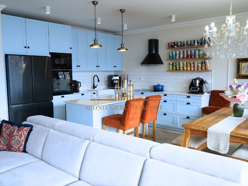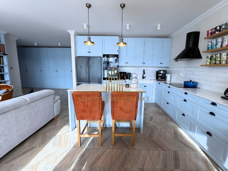 Wnętrze zostało zaprojektowane z dbałością o detale – jasna, ponadczasowa kolorystyka, zabudowy stolarskie na wymiar oraz wysokiej jakości materiały wykończeniowe tworzą elegancką i przytulną przestrzeń. Duże przeszklenia w części dziennej zapewniają doskonałe doświetlenie przez cały dzień. Salon płynnie łączy się z częścią jadalnianą oraz nowoczesnym aneksem kuchennym z wyspą.
