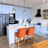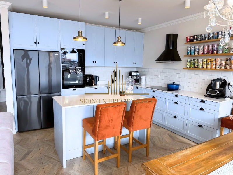 bogato wyposażona w sprzęt AGD energooszczędny, wysokiej jakości: lodówka Side by Side, winiarka, zmywarka AEG z szufladą na sztućce, mikrofalówka, piekarnik z funkcją pary, płyta indukcyjna ... Blaty kwarcowo-granitowe.