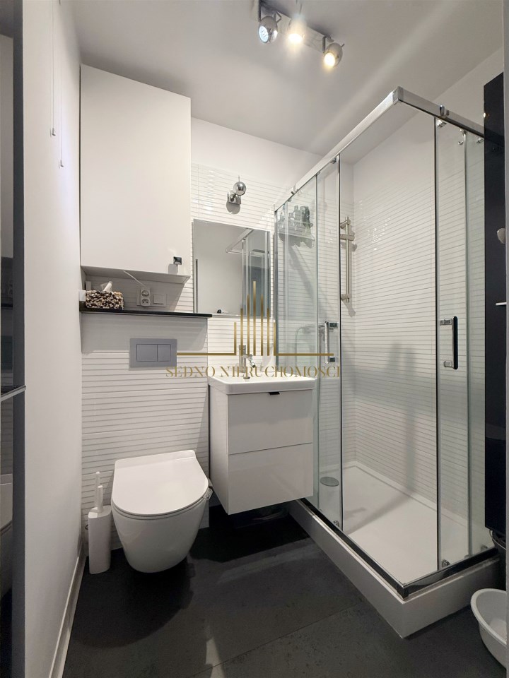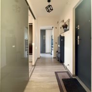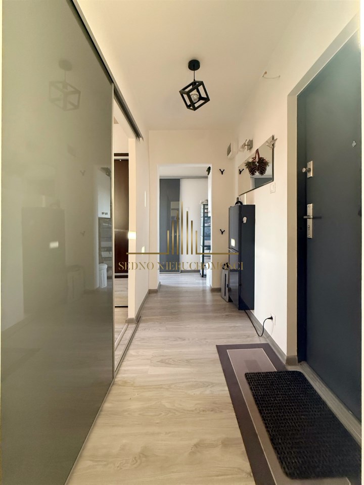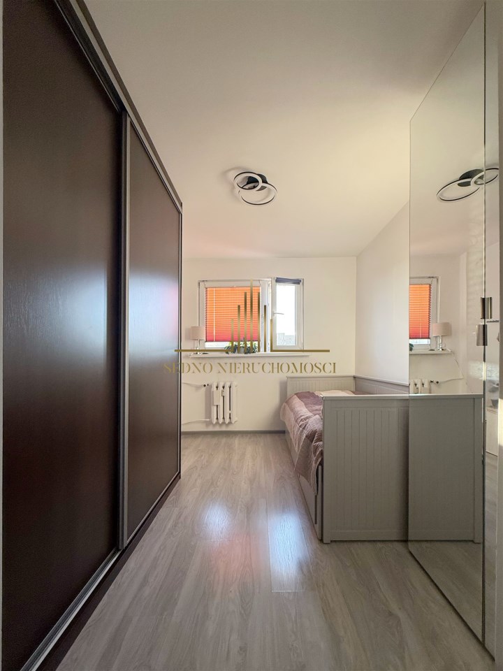 Dużym atutem są przesuwne drzwi, które zwiększają funkcjonalność przestrzeni. Mieszkanie jest jasne i dobrze doświetlone – okna wychodzą na stronę zachodnią, a dodatkowo naprzeciwko budynku nie ma innej zabudowy, co zapewnia większą prywatność.