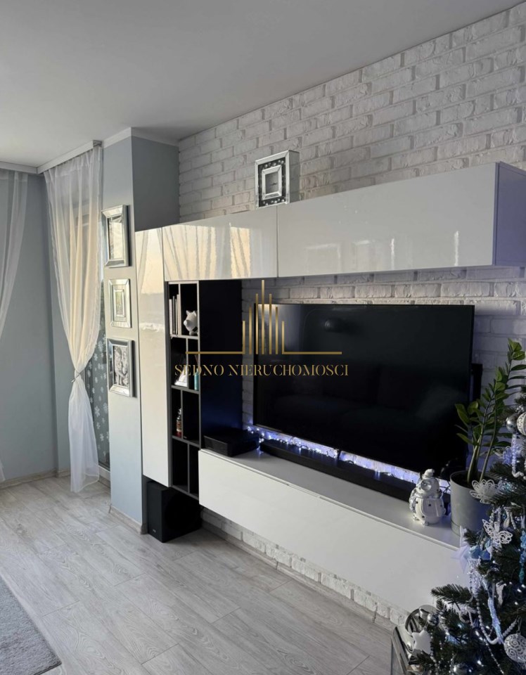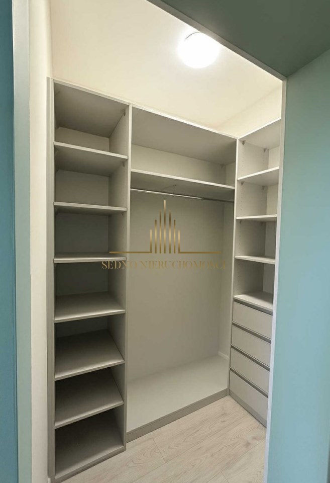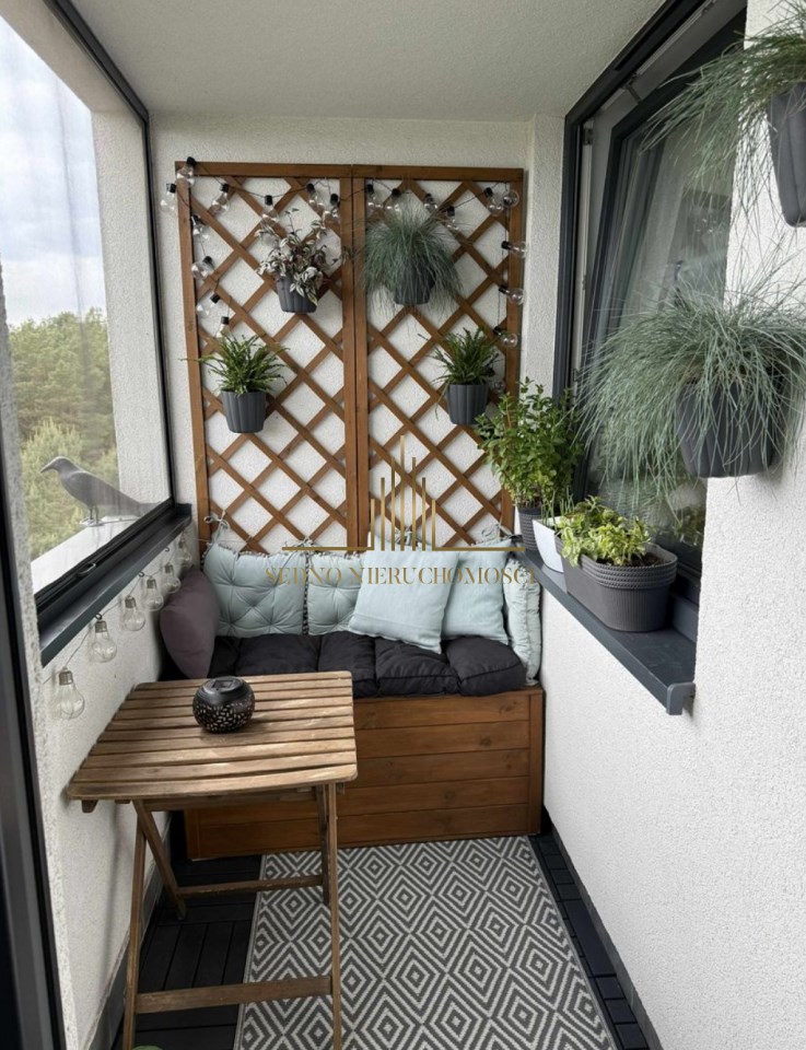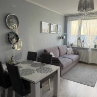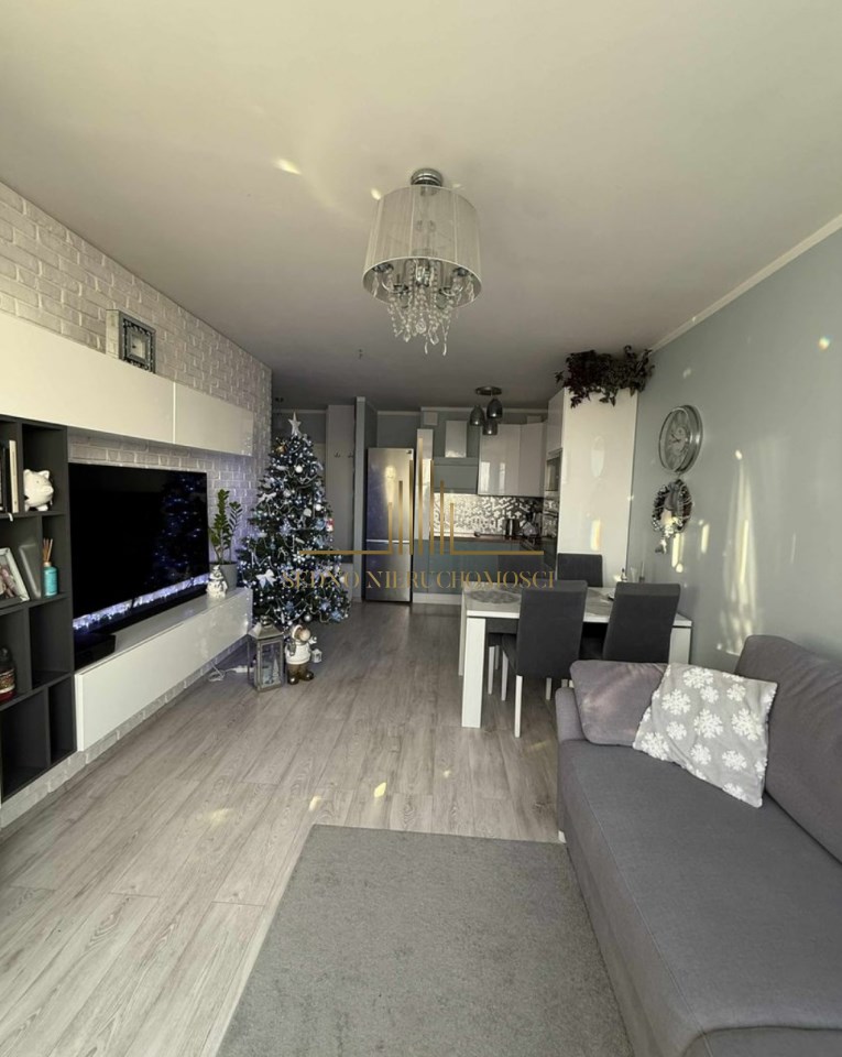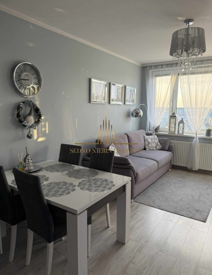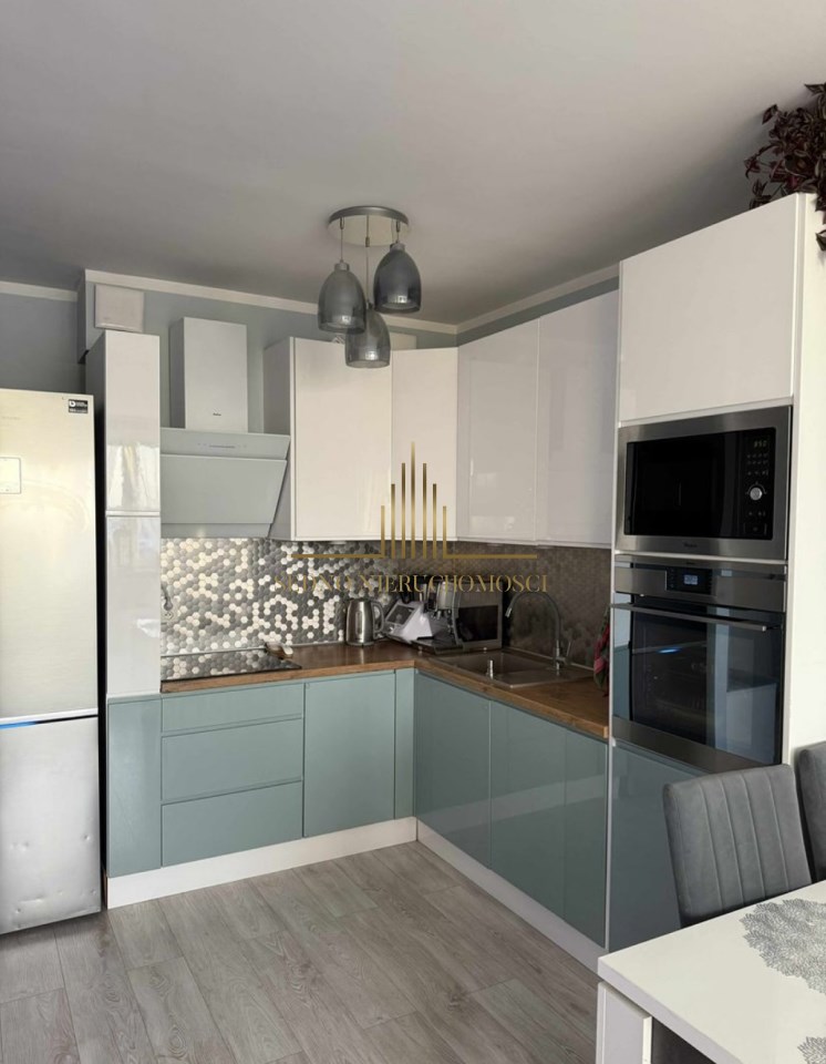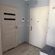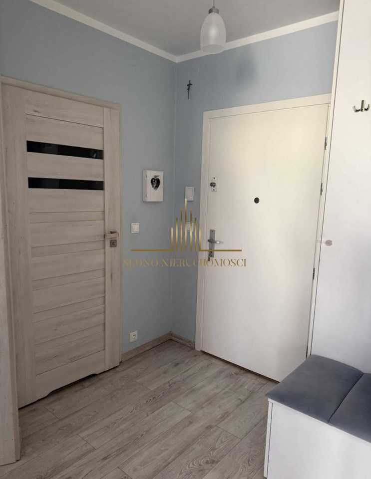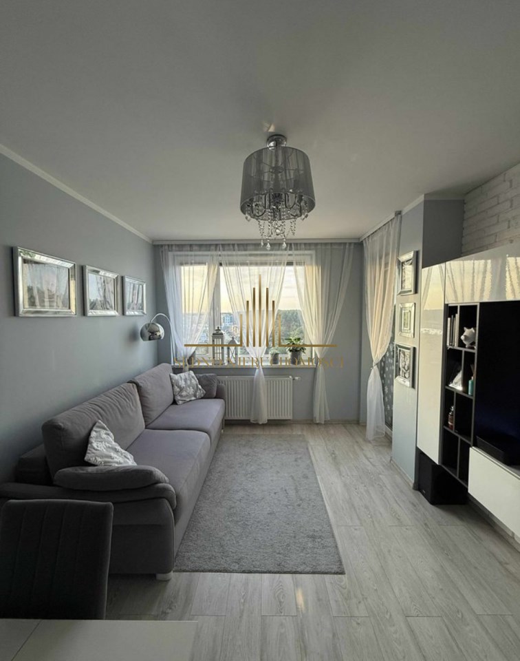 Wnętrze to salon z aneksem kuchennym i wyjściem na balkon, sypialnia, łazienka z WC, przedpokój. Mieszkanie urządzone i wykończone w stonowanym stylu i wysokim standardzie. Kuchnia wyposażona w meble i AGD. Mieszkanie umeblowane. Do mieszkania przynależy komórka lokatorska. W pobliżu bloku wiele wolnych miejsc parkingowych dla mieszkańców.
