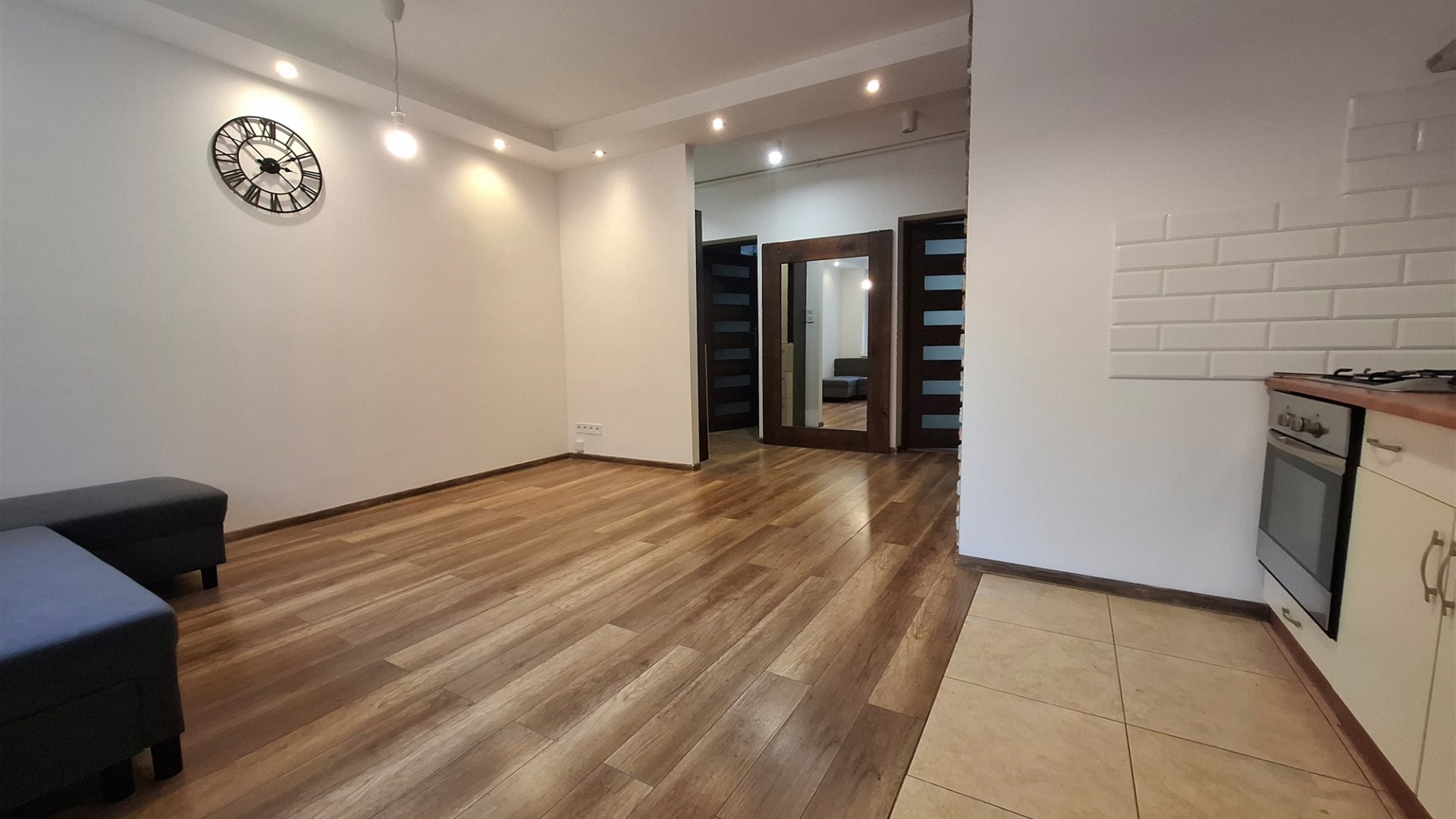 Mieszkanie składa się, z salonu z aneksem, dwóch nieprzechodnich sypialni i łazienki z WC. Mieszkanie w bloku z lat '80 na I piętrze. Okna salonu wychodzą na północ, zaś sypialniane na południe. Do mieszkania przynależy ogromna piwnica. Miejsce postojowe na podwórku.
