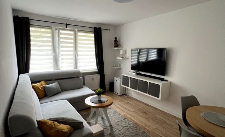 Umeblowanie w cenie kuchnia zabudowa, sprzęty AGD: piekarnik, płyta gazowa, zmywarka. W sypialni łóżko małżeńskie i szafę typu Komandor. Pokój wyposażony w kanapę, zabudowę typu Komandor i zabudowę szafy w korytarzu.