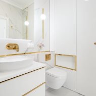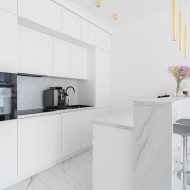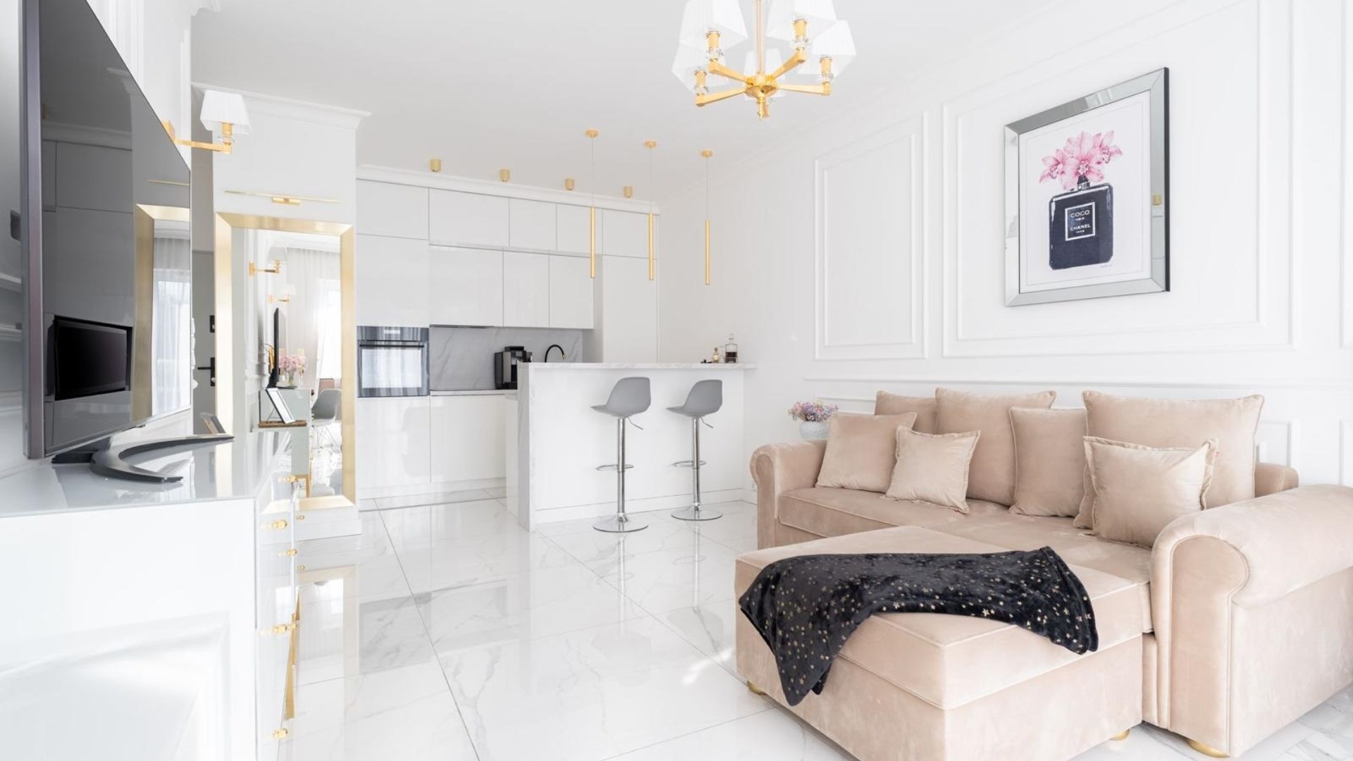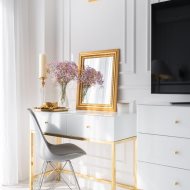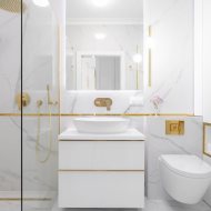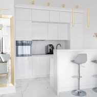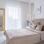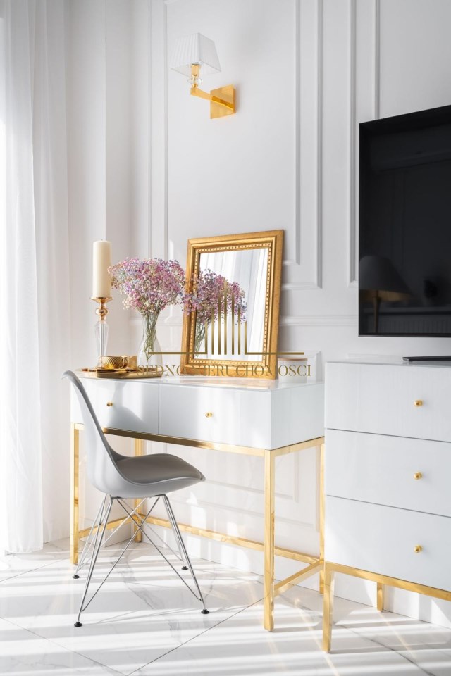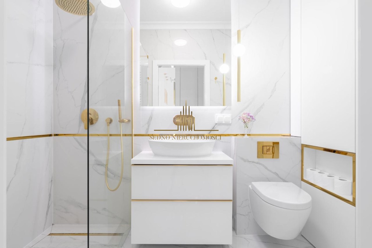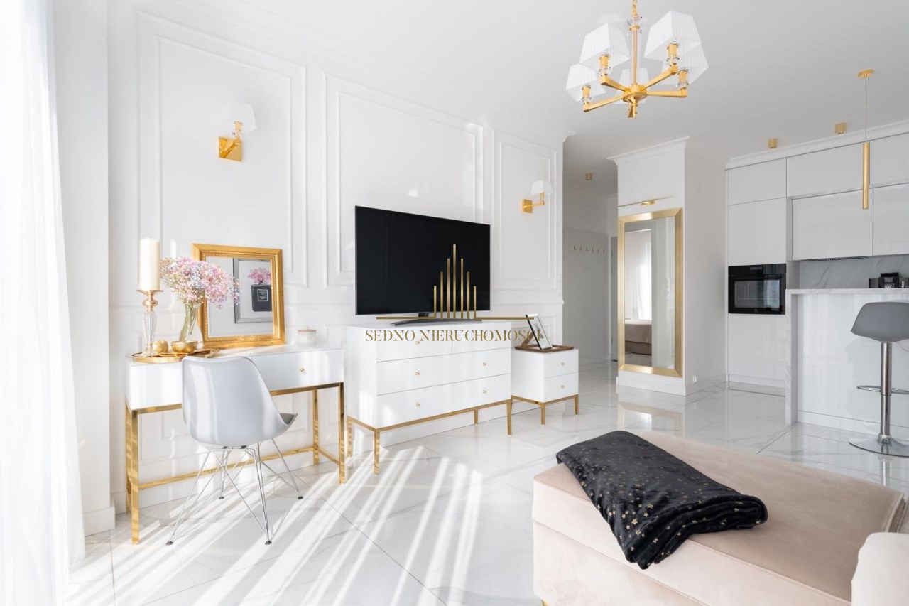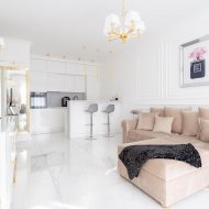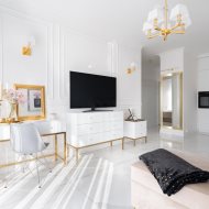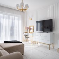 Mieszkanie charakteryzuje się wysokim standardem wykończenia, do którego użyto materiałów dobrej jakości oraz zadbano o każdy detal, zarówno o aspekt wizualny, jak i funkcjonalny. Zaprojektowane wnętrze zostało przemyślane, aby maksymalnie zagospodarować dostępny metraż, co pozwoliło na stworzenie przestronnej i przytulnej strefy komfortu. Mieszkanie jest utrzymane w stonowanej kolorystyce bieli, beżu, grafitu z elementami złota, co nadaje mu elegancji i sprawia, że pomieszczenia współgrają ze sobą. Dzięki niebanalnemu wykończeniu i wyposażeniu wnętrze ma klimat, w którym chce się przebywać i do którego z przyjemnością się wraca.