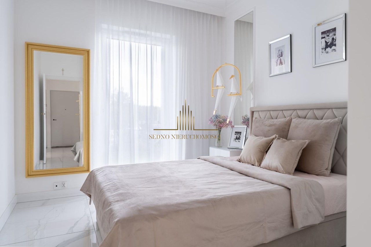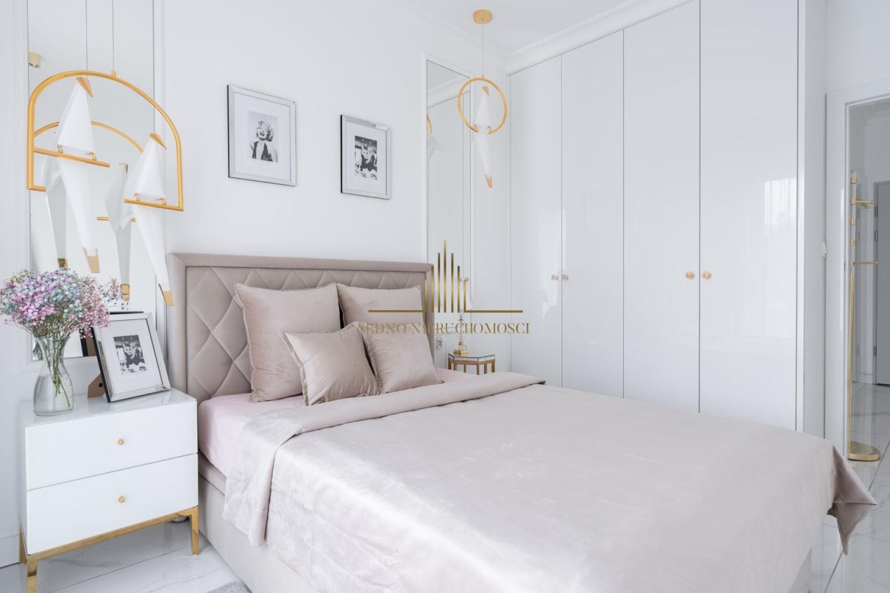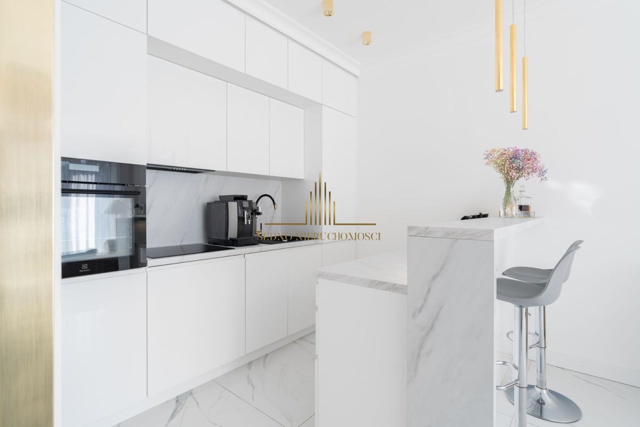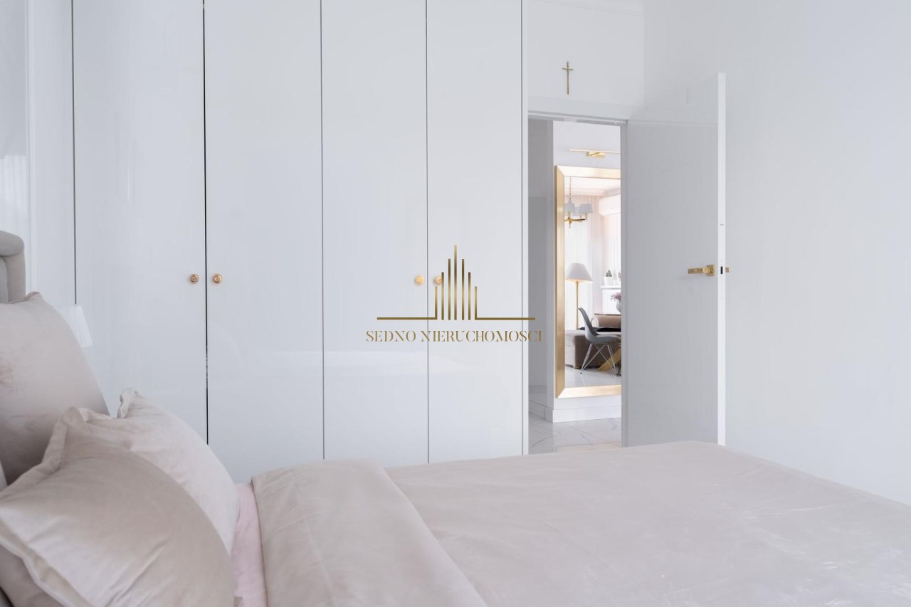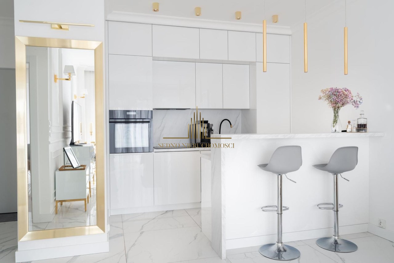 Wszystkie zabudowy - aneks kuchenny z wyspą, szafy: w sypialni, przedpokoju i łazience, a także panel ścienny stanowiący garderobę zostały wykonane na wymiar i stanowią komplet. Aneks kuchenny jest w pełni wyposażony w sprzęt AGD (lodówkę, zamrażarkę, piekarnik, płytę indukcyjną, okap i zmywarkę). Pomieszczenia zostały wykończone sztukaterią przysufitową z odlewów gipsowych wykonanych na zamówienie. Uroku sypialni i łazience dodają lustra wykonane na wymiar. W mieszkaniu zamontowano klimatyzację oraz wideo domofon. Cena mieszkania obejmuje zabudowę stałą.