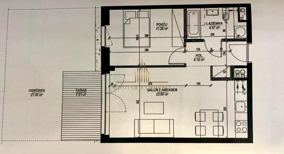 - salonu z wyjściem na ogródek 27,5 m2 połączonego z aneksem kuchennym,