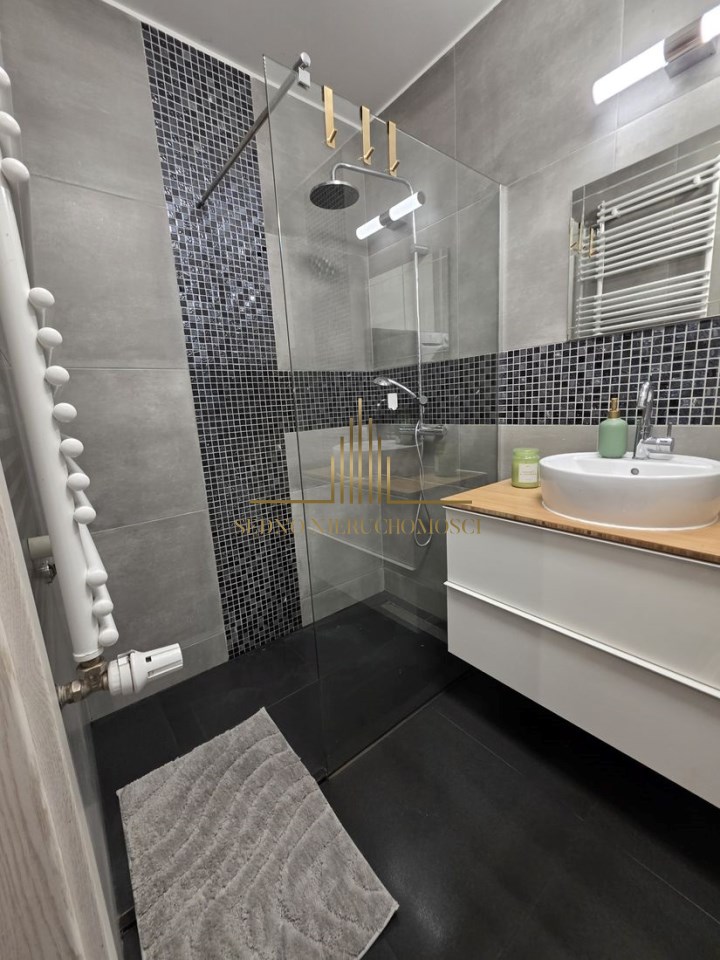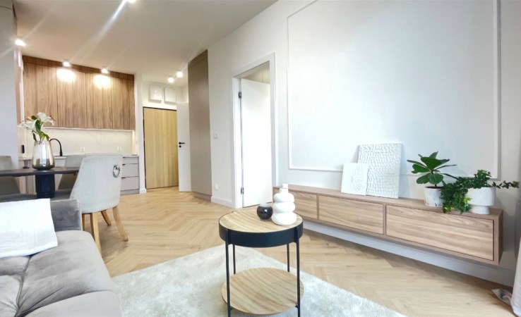 - Powierzchnia: 58,5 m² (salon z aneksem kuchennym 25,6 m², pokój 12,4 m², sypialnia 8,9 m², łazienka 5 m², korytarz 7,5 m²)