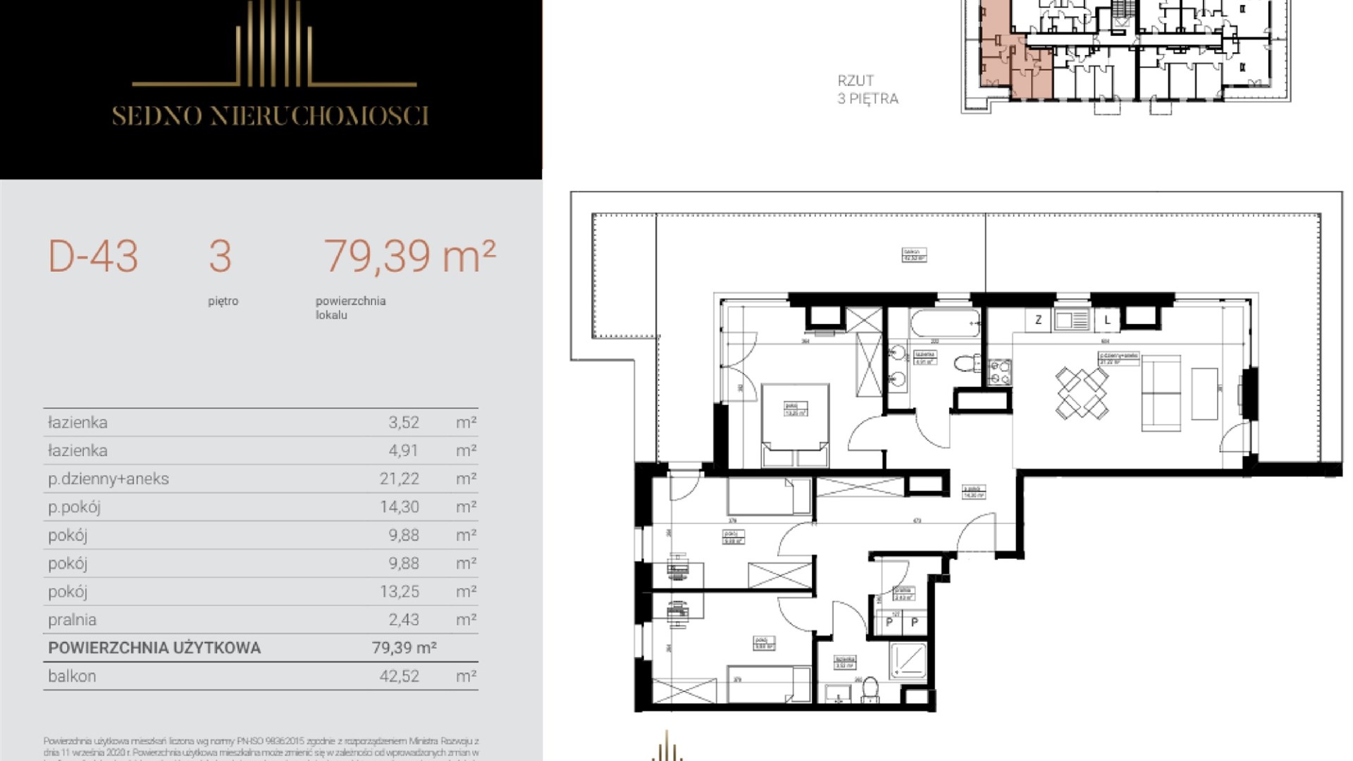 | Powierzchnia balkonów/tarasów | 42,52 m² |