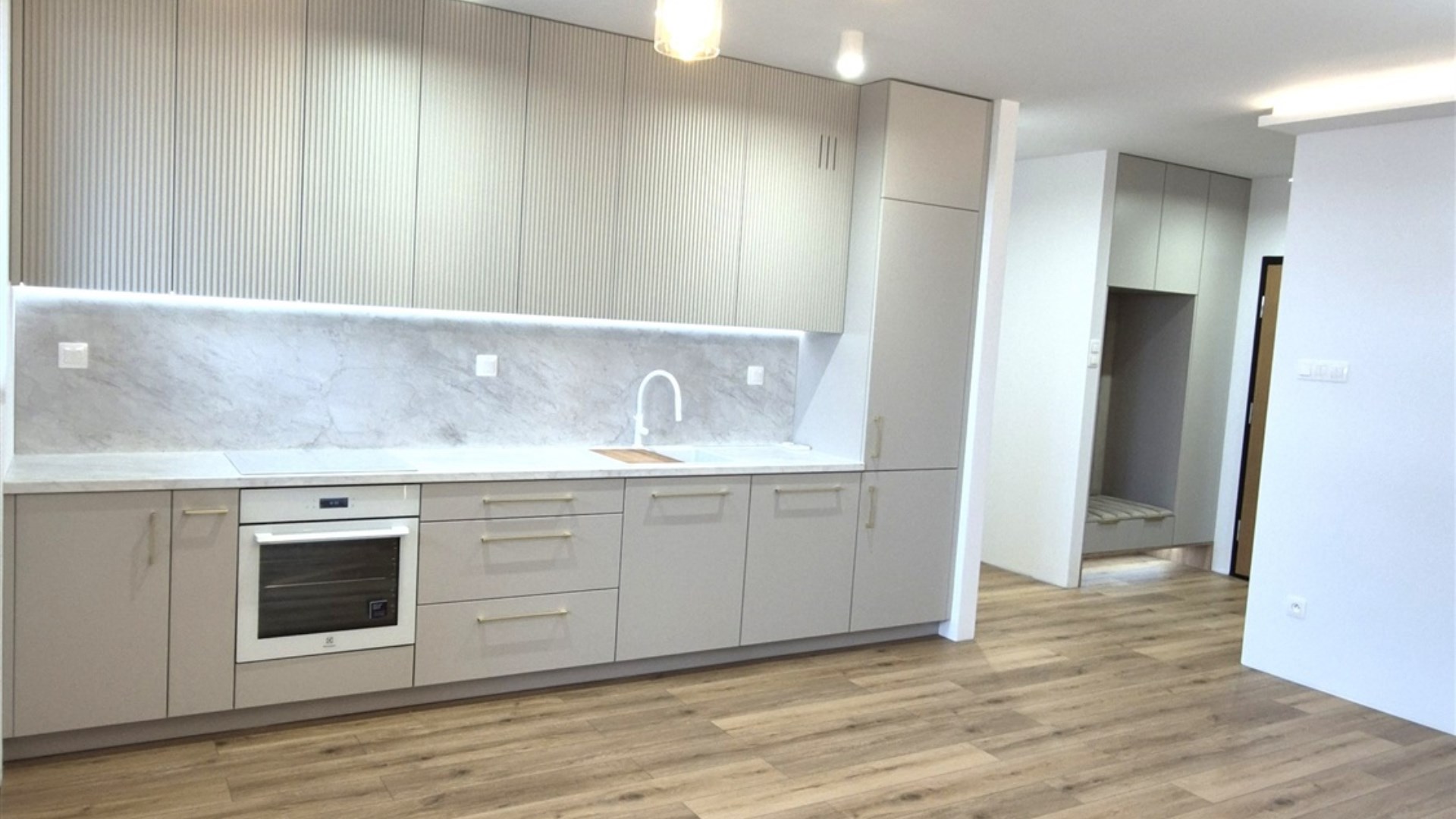 Zaprojektowany przez doświadczonego architekta, apartament wyróżnia się wysokiej jakości wykończeniem m.in podłoga z winylu wodoodpornego marki Quick Step, kuchnia: fornir dębowy + lakier,  blaty, farby ceramiczne + sztukaterie, płytki wielkoformatowe Tubądzin + ceramika oraz biżuteryjne złote dodatki i armatura Omnires, drzwi wewnętrzne bezprzylgowe marki DRE model Nova 70