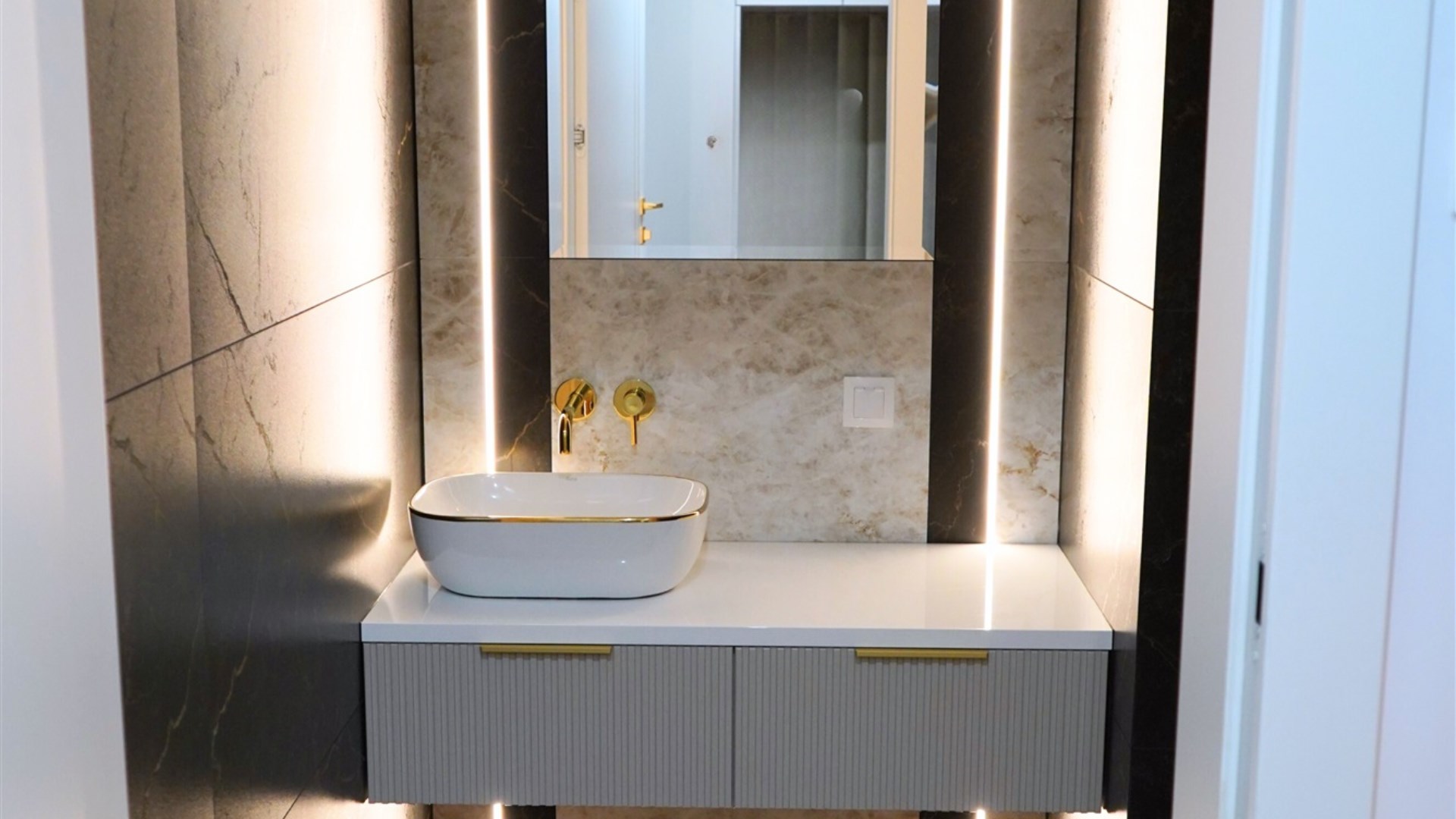 Zaprojektowany przez doświadczonego architekta, apartament wyróżnia się wysokiej jakości wykończeniem m.in podłoga z winylu wodoodpornego marki Quick Step, kuchnia: fornir dębowy + lakier, blaty, farby ceramiczne + sztukaterie, płytki wielkoformatowe Tubądzin + ceramika oraz biżuteryjne złote dodatki i armatura Omnires, drzwi wewnętrzne bezprzylgowe marki DRE model Nova 70