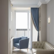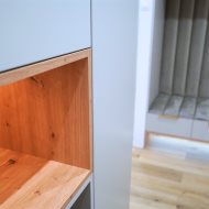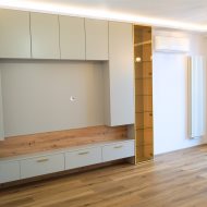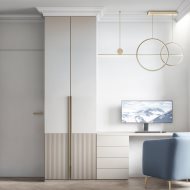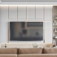 Rozkład pomieszczeń umożliwia wydzielenie strefy dziennej, przestrzeni do pracy i relaksu. Zabudowa meblowa została wykonana przez stolarza, na wymiar, co pozwoliło na optymalne wykorzystanie przestrzeni. W mieszkaniu zastosowano także liczne źródła i typy zdalnie sterowanego oświetlania, co pozwala na uzyskanie dowolnego klimatu – w zależności od potrzeb i pory dnia.