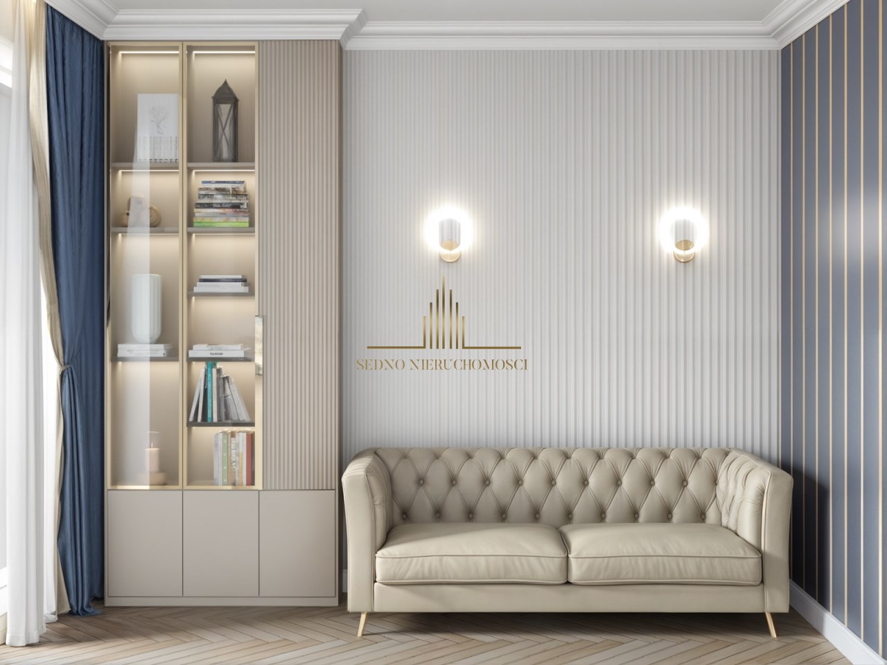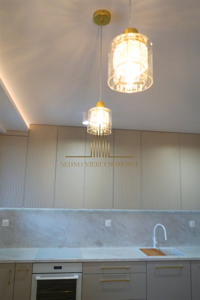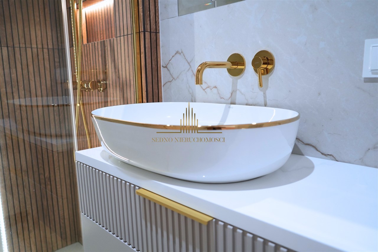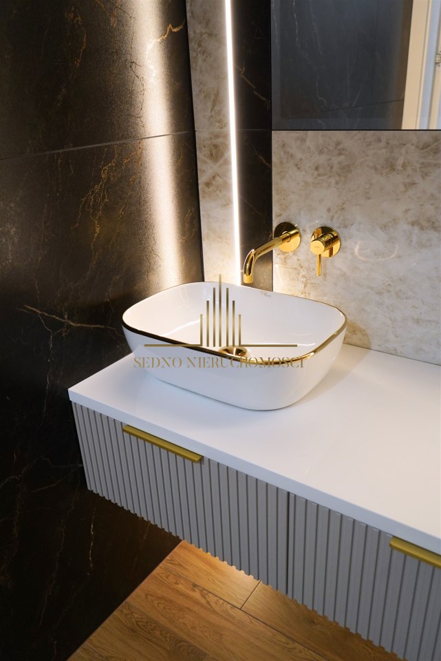 Zaprojektowany przez doświadczonego architekta, apartament wyróżnia się wysokiej jakości wykończeniem m.in podłoga z winylu wodoodpornego marki Quick Step, kuchnia: fornir dębowy + lakier, blaty, farby ceramiczne + sztukaterie, płytki wielkoformatowe Tubądzin + ceramika oraz biżuteryjne złote dodatki i armatura Omnires, drzwi wewnętrzne bezprzylgowe marki DRE model Nova 70