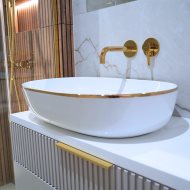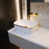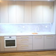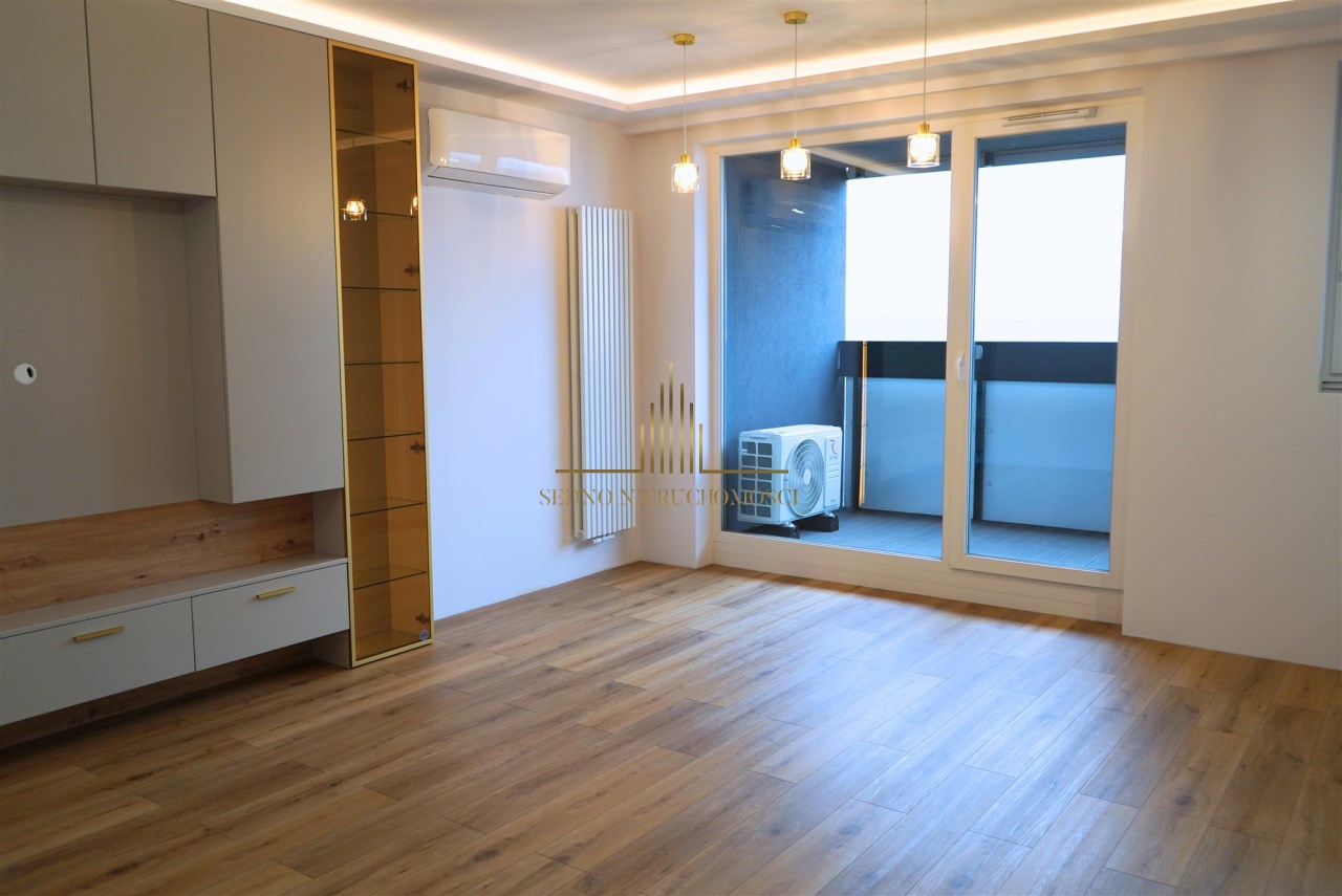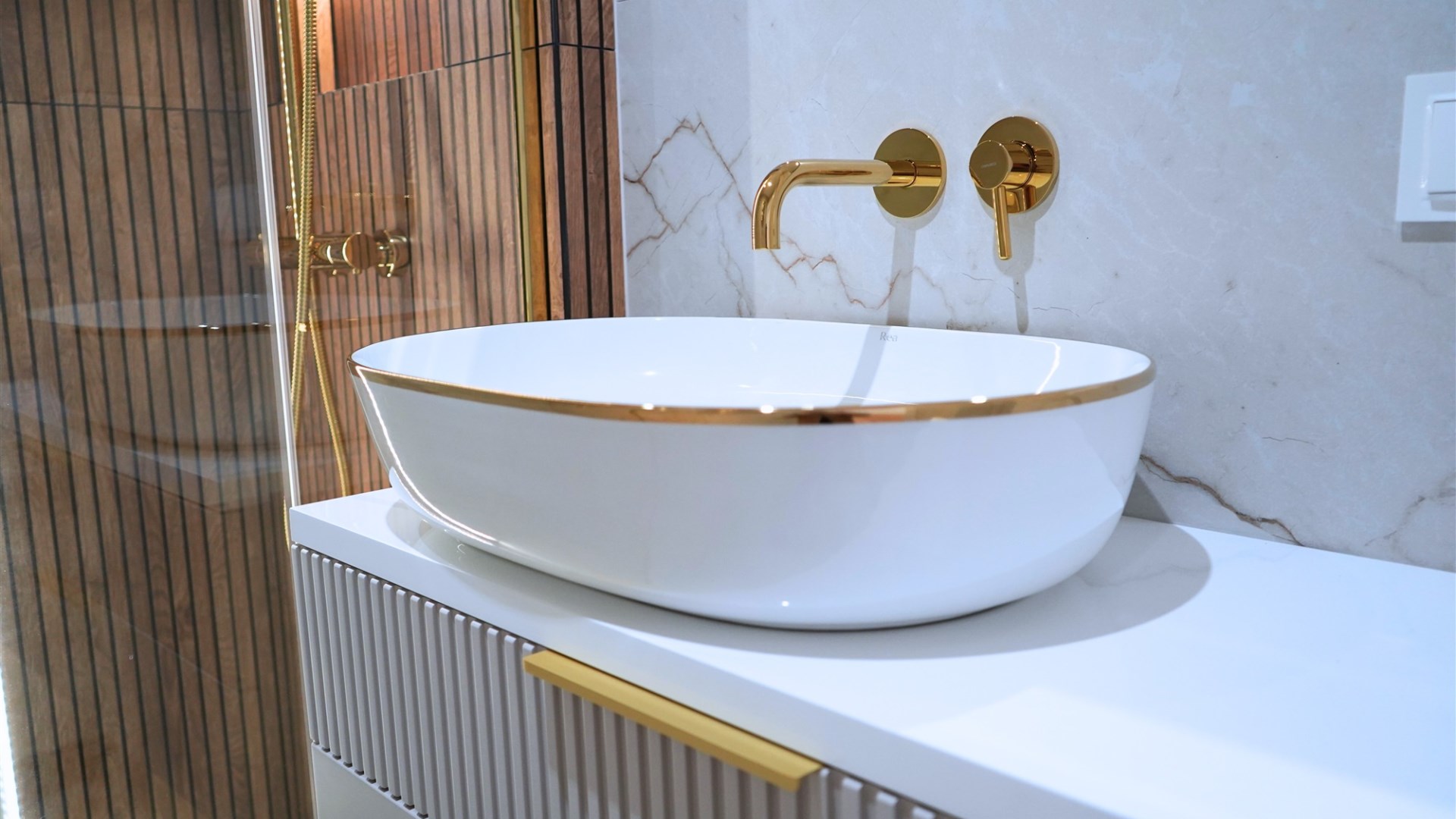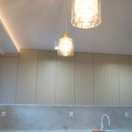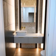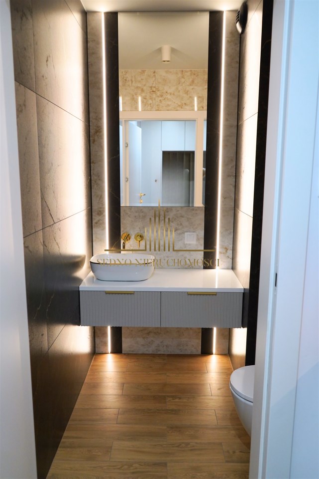 Zaprojektowany przez doświadczonego architekta, apartament wyróżnia się wysokiej jakości wykończeniem m.in podłoga z winylu wodoodpornego marki Quick Step, kuchnia: fornir dębowy + lakier, blaty, farby ceramiczne + sztukaterie, płytki wielkoformatowe Tubądzin + ceramika oraz biżuteryjne złote dodatki i armatura Omnires, drzwi wewnętrzne bezprzylgowe marki DRE model Nova 70
